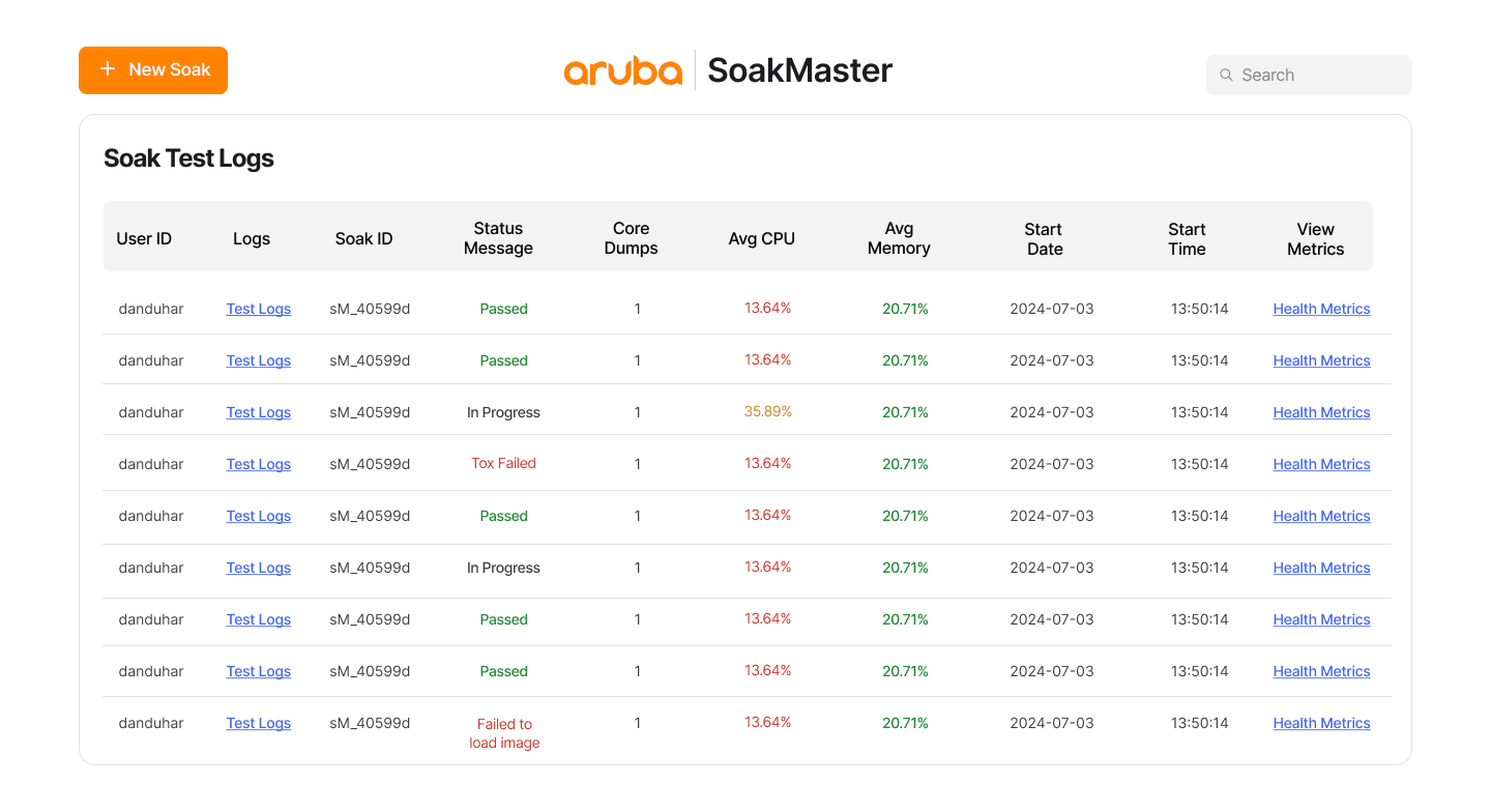 When Alex opens SoakMaster, he looks for quick answers: what’s running, what’s completed, and whether anything needs attention. The dashboard displays ongoing and recent soak runs along with key details, giving him immediate clarity on the current state of testing.