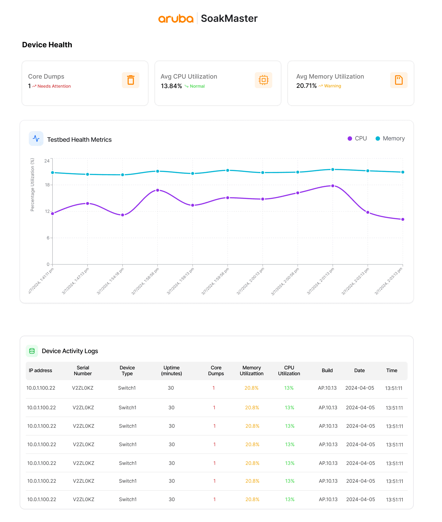 After running a soak test, Alex can view device health metrics to understand how the device performed over the duration of the test.